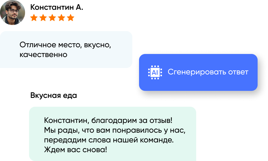 Настройте умные ответы на отзывы за пару минут. ИИ анализирует тон, оценку и содержание отзыва, чтобы ответить вежливо с обращением по имени и максимально точно.
