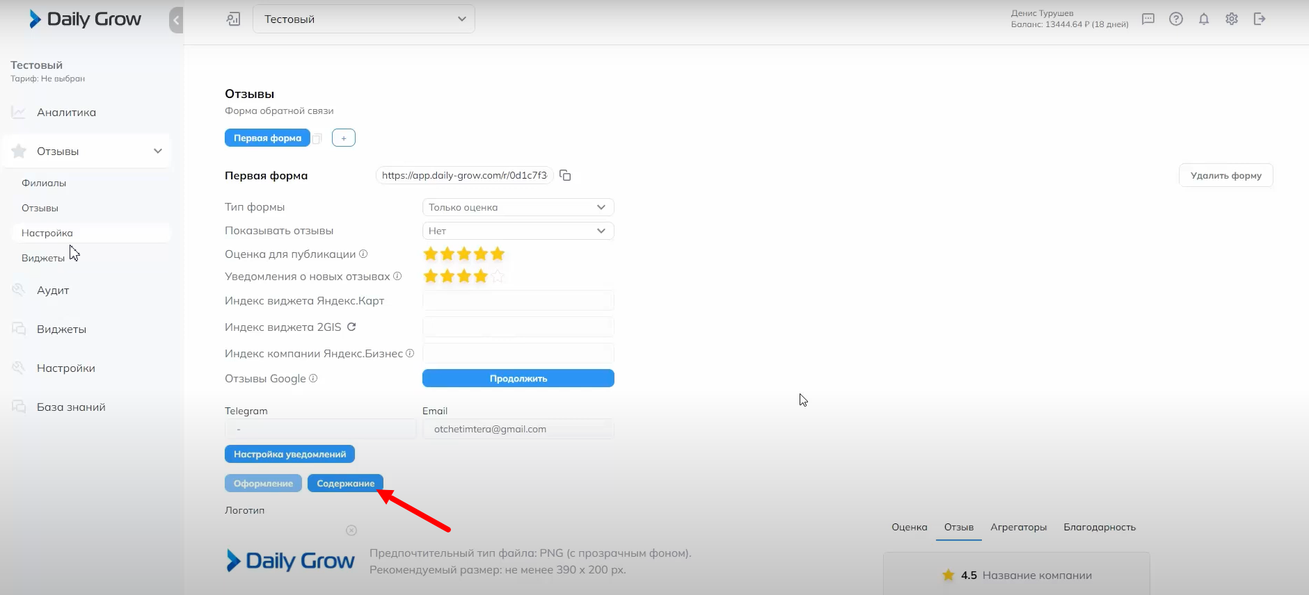 Чтобы вставить ссылку на карты в форму сбора отзывов переходим в форму сбора отзывов и нажимаем на кнопку Содержание