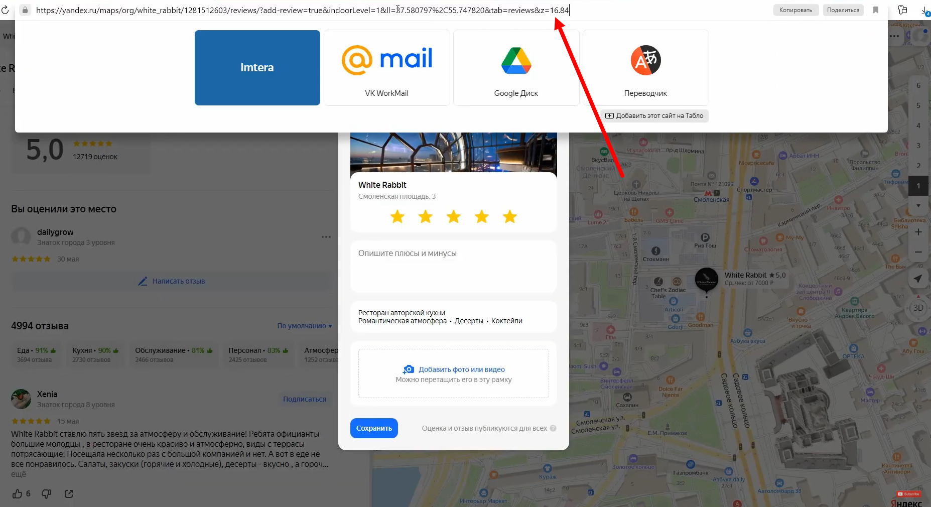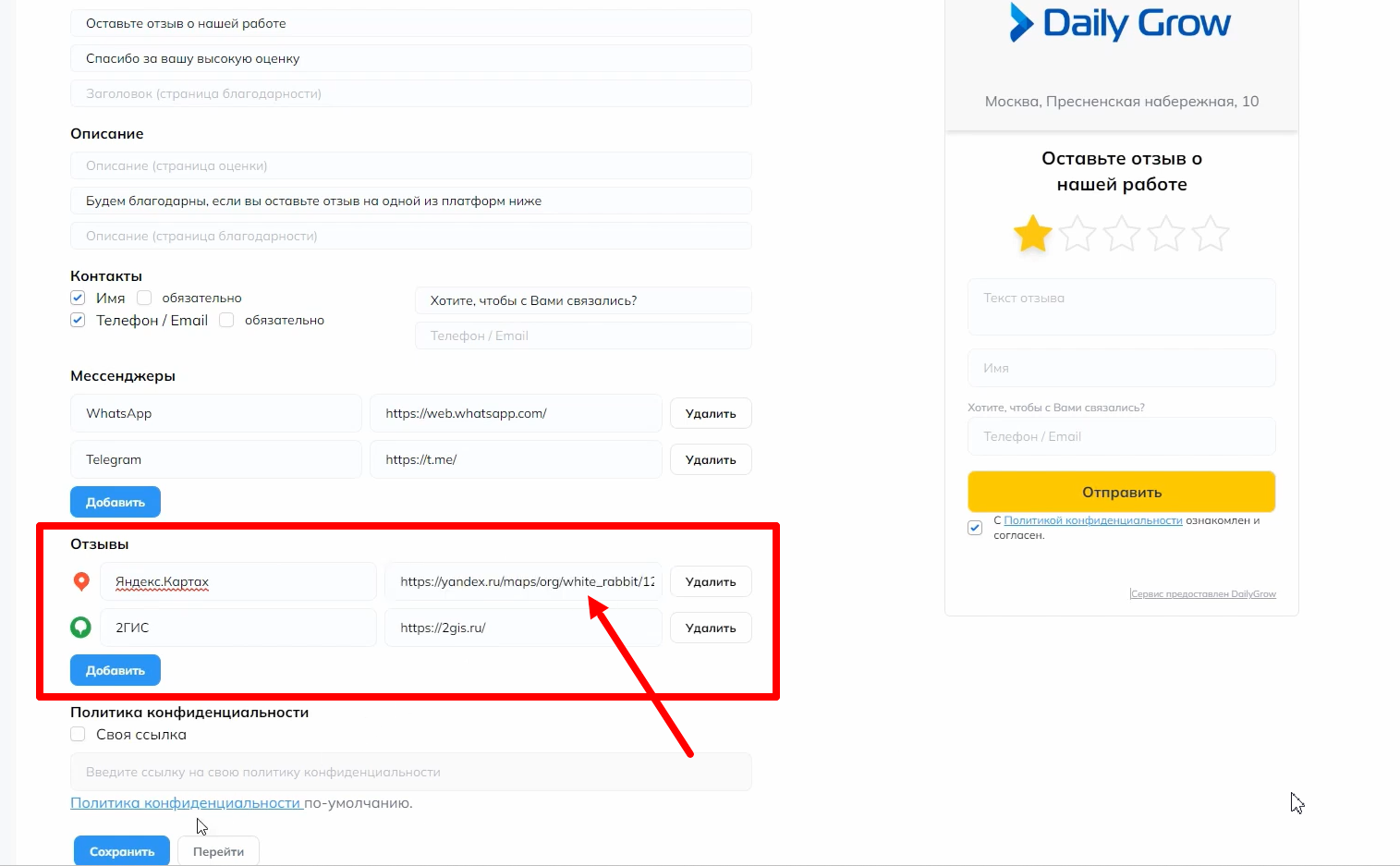 Листаем вниз, находим блок Отзывы и выбираем нужную нам площадку: Яндекс Карты, 2ГИС или Google карты, если площадки нет, нажимаем кнопку добавить.