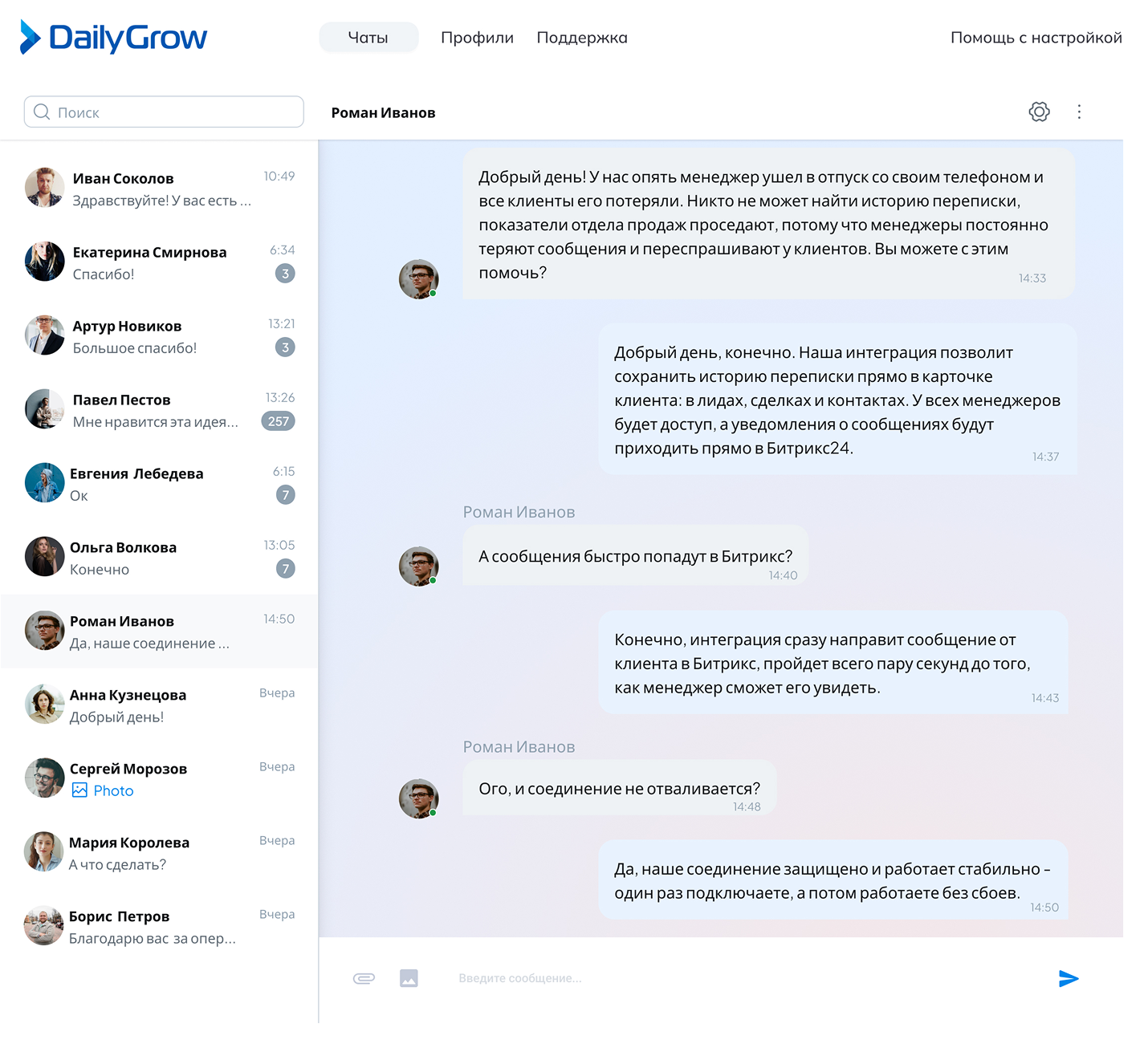 Менеджер видит всю историю общения и заказов. Ответить можно сразу из карточки или через встроенный мессенджер.