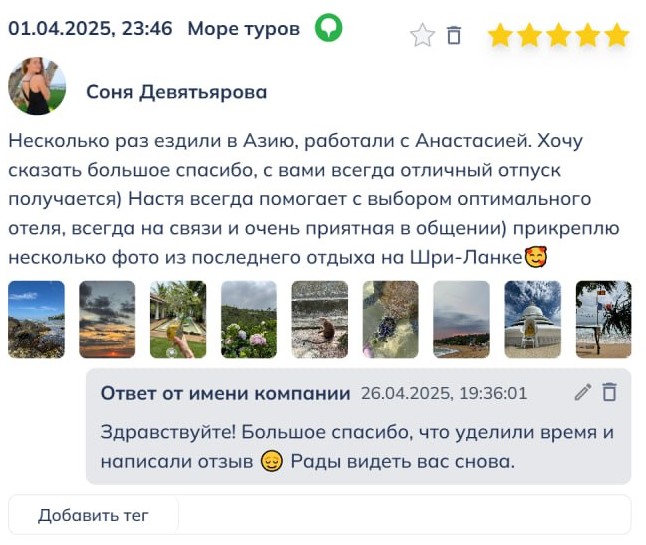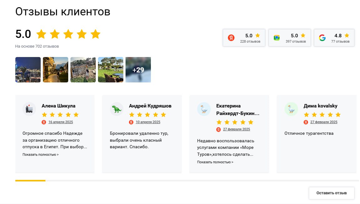 В туристической отрасли доверие клиентов играет решающую роль. Потенциальные путешественники активно читают отзывы перед покупкой тура, а значит, компании важно управлять репутацией и показывать реальные истории довольных клиентов.