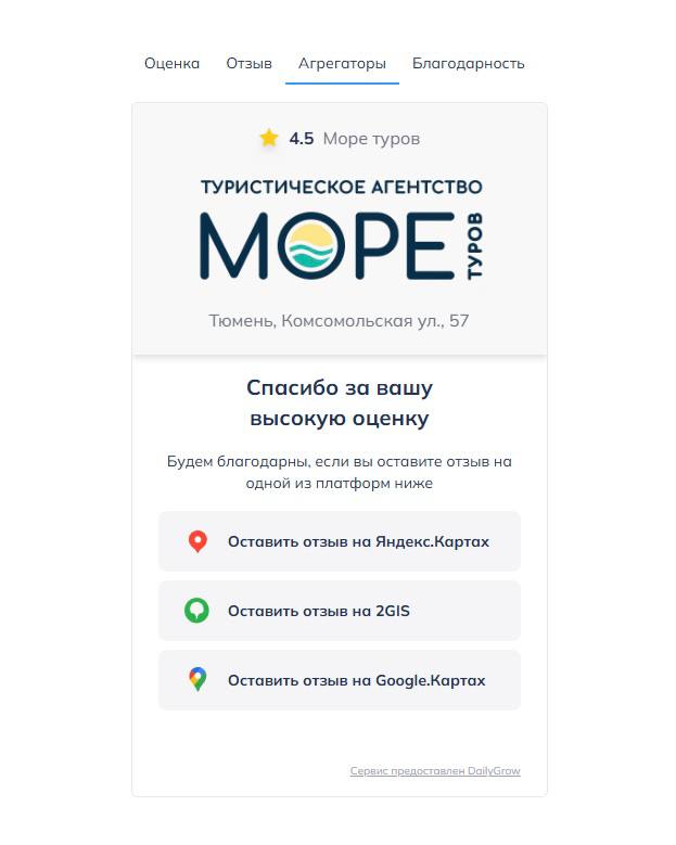 Компания «Море туров» столкнулась с типичной проблемой: высокое качество сервиса не отражалось в рейтинге и количестве переходов с поисковых систем и карт. Помочь изменить ситуацию удалось с помощью бесплатного виджета отзывов от DailyGrow.